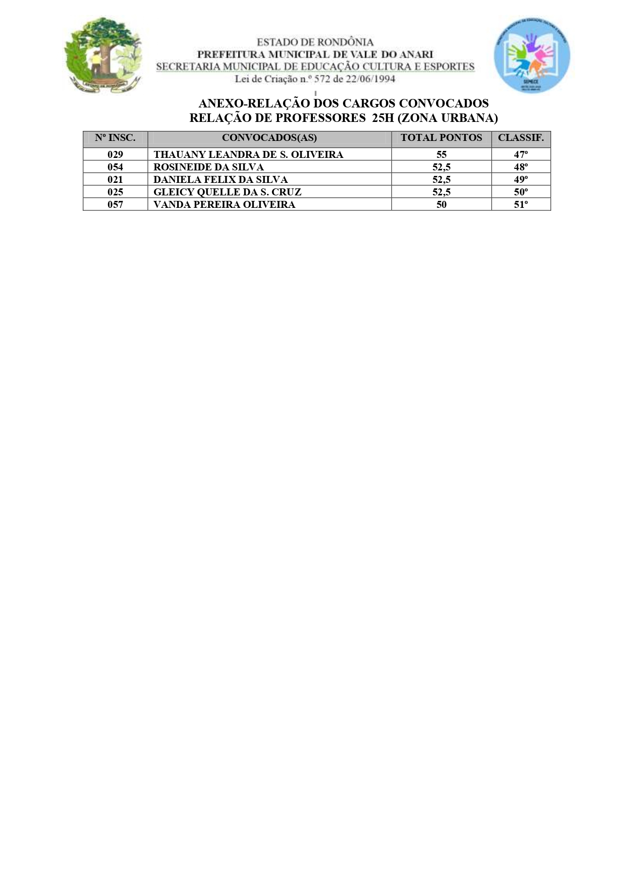 A SECRETÁRIA MUNICIPAL DE EDUCAÇÃO, CULTURA E ESPORTES DE VALE DO ANARI, Estado de Rondônia, no exercício de suas atribuições e em conformidade com o item 16.1 do Edital do Processo Seletivo Simplificado nº 001/SEMECE/2024, considerando o Resultado Final do referido certame, homologado em 21 de junho de 2024,