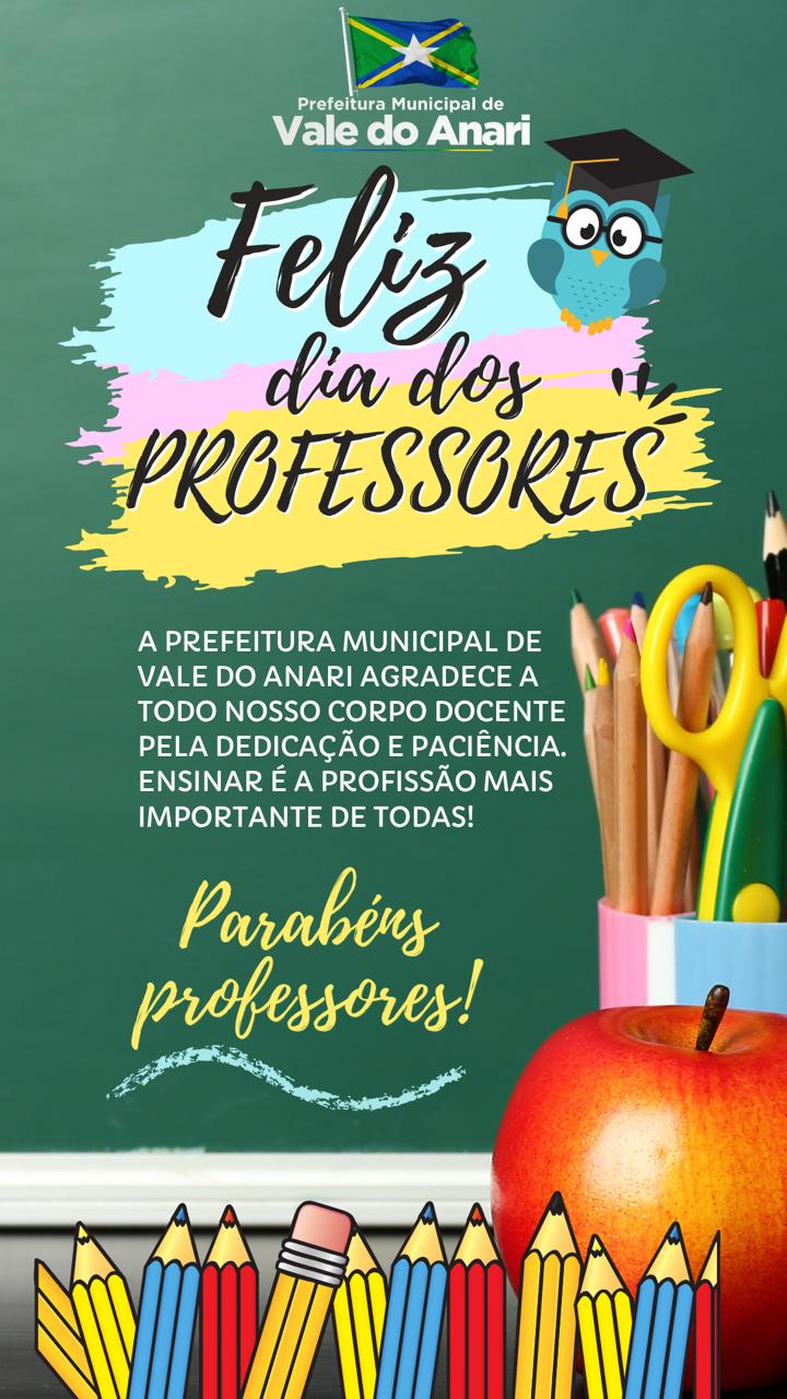 A Prefeitura Municipal de Vale do Anari parabeniza todos os professores e professoras que, com empenho e compromisso, transformam o futuro por meio da educação.