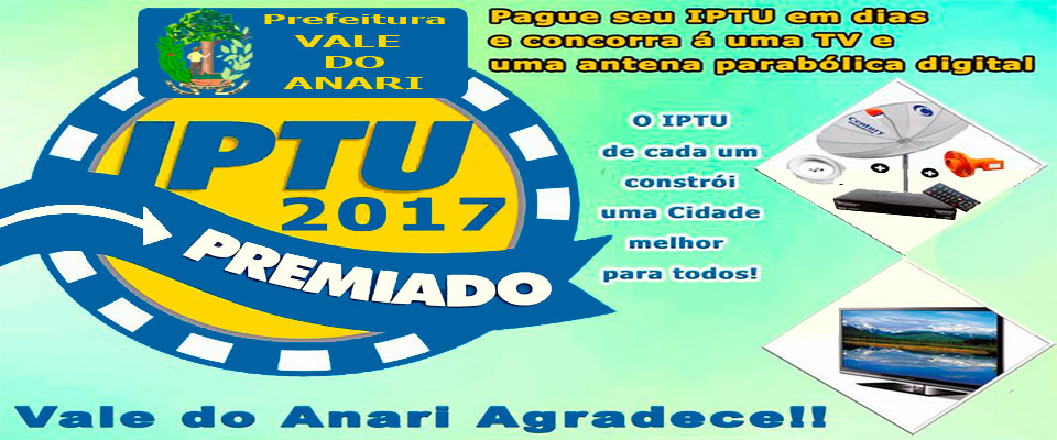 O Prefeito de Vale do Anari, prorrogou o prazo para o pagamento do IPTU 2017. Os contribuintes que pagarem o valor total até o dia 15 de Outubro terão desconto de 10% (dez por cento). Para os contribuintes que optarem pelo parcelamento este poderá ser feito em duas parcelas, sendo a primeira com vencimento para […]