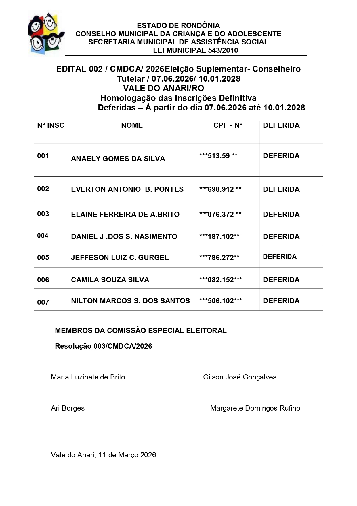 A Prefeitura Municipal de Vale do Anari, por meio da Secretaria Municipal de Administração e Fazenda, torna público o Termo de Homologação do Processo Seletivo Simplificado nº 001/2025/PMVA/SEMAF/RO, conforme resultado final publicado no edital.