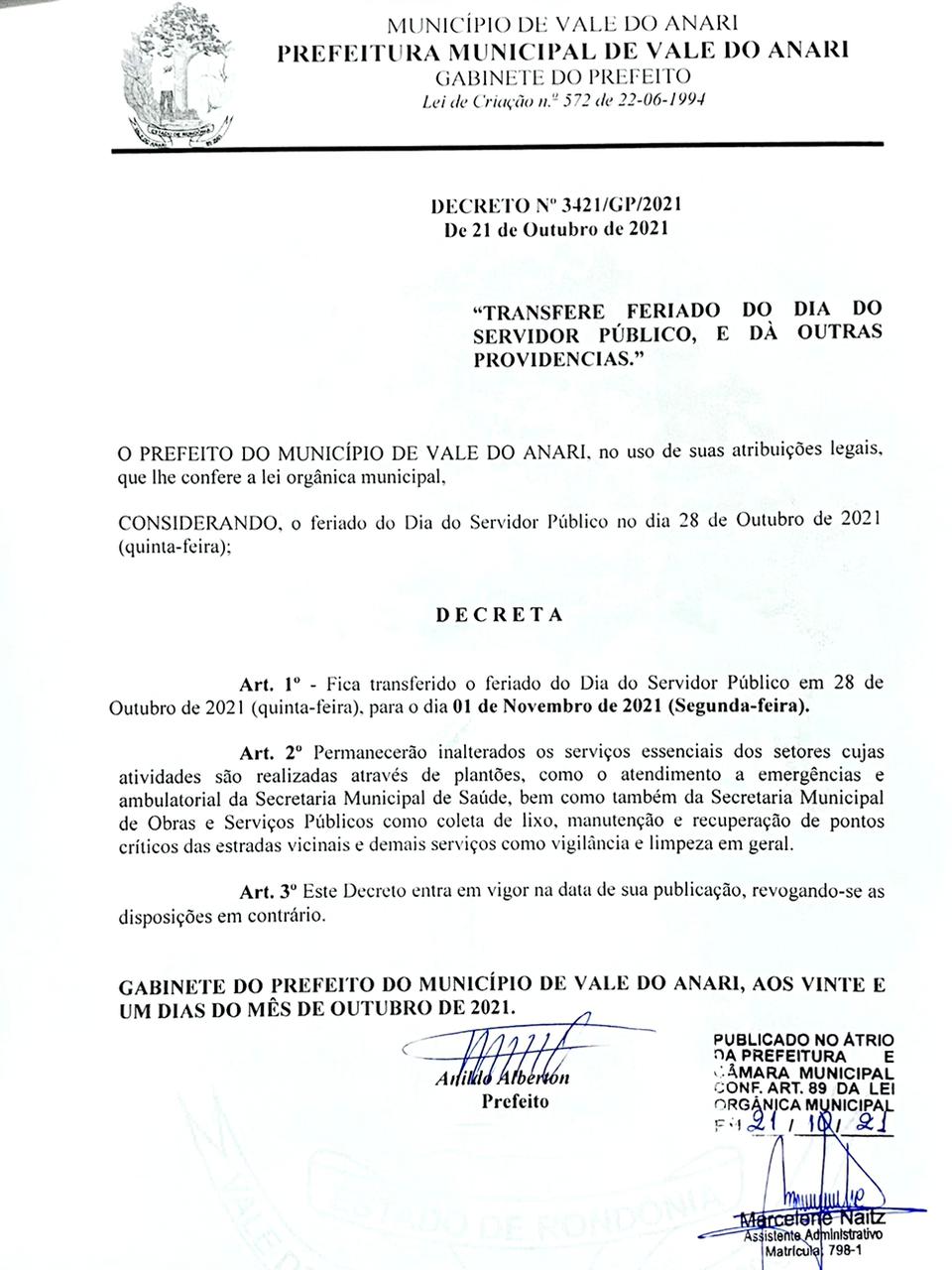 A prefeitura de Vale do Anari, publicou o Decreto 3421/GP/2021, onde transfere o feriado do dia do Servidor Público comemorado no dia 28 de outubro (quinta-feira) para 01 de novembro (segunda-feira).
